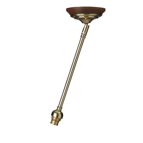 Brass rod suspension with offset swivel ceiling plate and woodblock. Shown in polished brass.