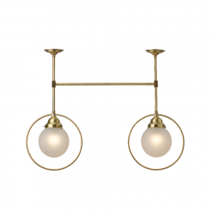 Two light, single cross arm, brass rod suspension pendant with hoops, displayed in polished brass.