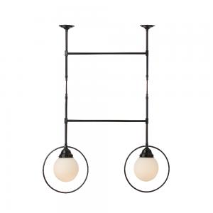 Two light pendant with dual cross arms, suspended by cords. Comes with hoops around shades, displayed in matt black.